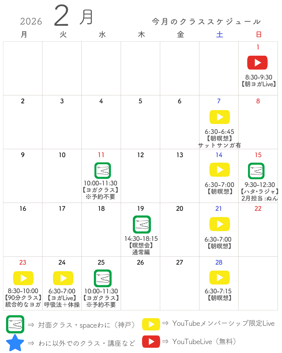 神戸のスタジオ「spaceわに」など、対面で行うクラスは以下の通りです。