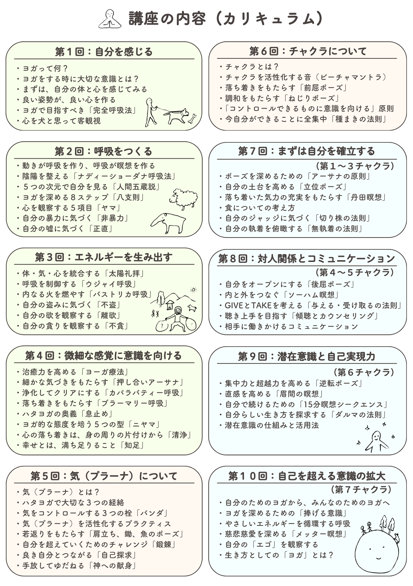 10回も続けられるか不安という方のために、10回講座の入口部分をお伝えする、約3時間の講座「暮らしに生かす、体と心のヨガ入門」の動画コンテンツ(2024年入門講座のアーカイブ)も販売しております。受講を迷われている方は、よければこちらもご検討くださいませ。