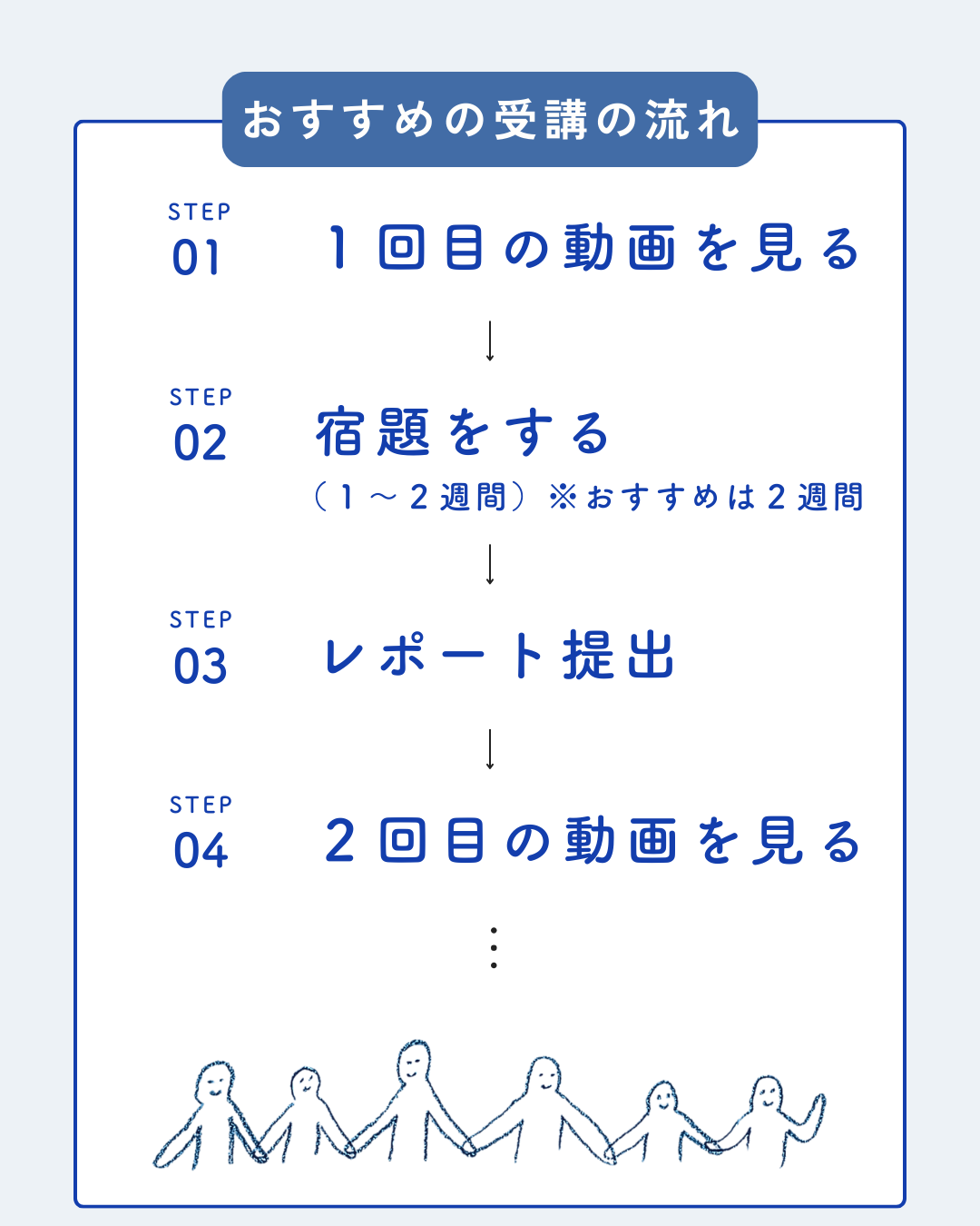 とは言え、せっかくの動画受講なので、この通りでなくても、仕事や家庭の都合に合わせて、マイペースに続けていただくのも良いと思います。無理なく、楽しみながら続けてみてください。