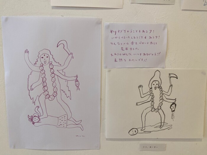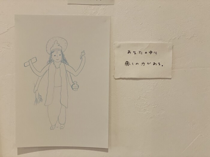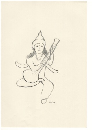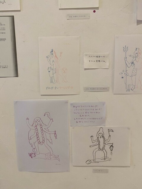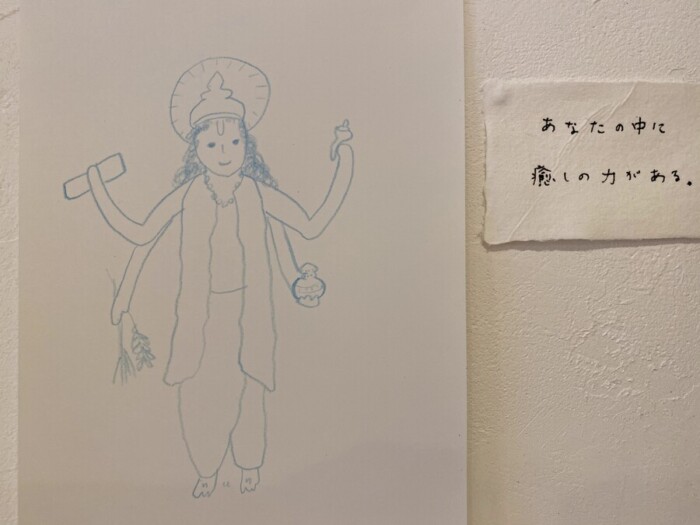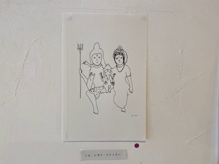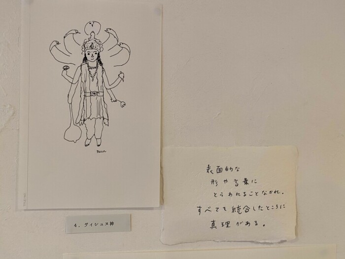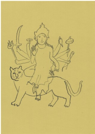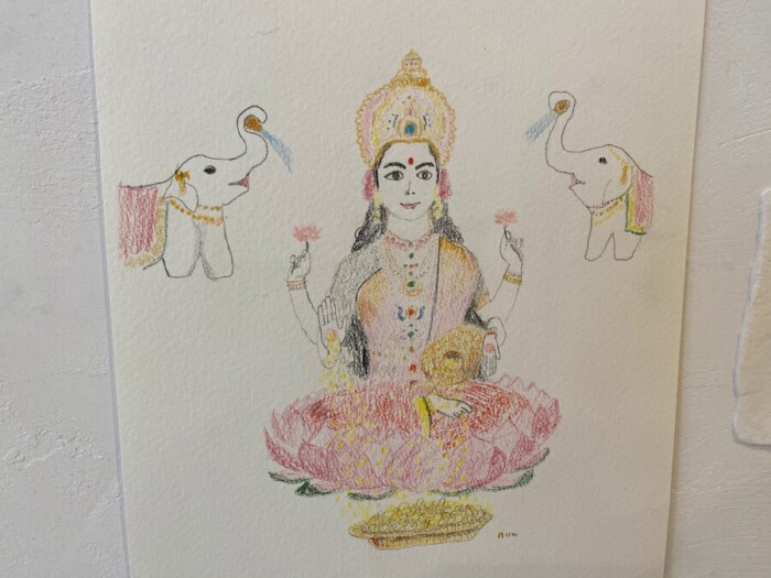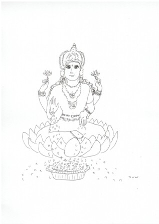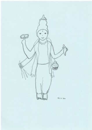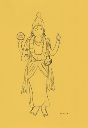 奥さんは「ラクシュミー(吉祥天)」。手に持つのは、円盤(チャクラ)、こん棒、ほら貝、蓮の花。蛇王(アナンタ)の上で休んだり瞑想するらしい。