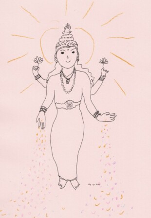 手に持つのは、蓮の花、珠数、ヴェーダ聖典、水瓶。
